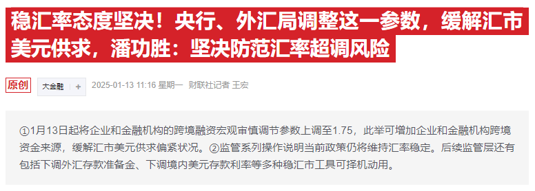 之前就和说了,天然当今处于战术空窗期,但跟着股市下落、商场姿色走弱,战术呵护力度详情会增强。今天一早央行就动手稳汇率,央行和外汇局一早公告,自1月13日起将企业和金融机构的跨境融资宏不雅审慎调理参数上调至1.75。众人暗示,此举可增多企业和金融机构跨境资金开端,缓解汇市好意思元供求偏紧气象。